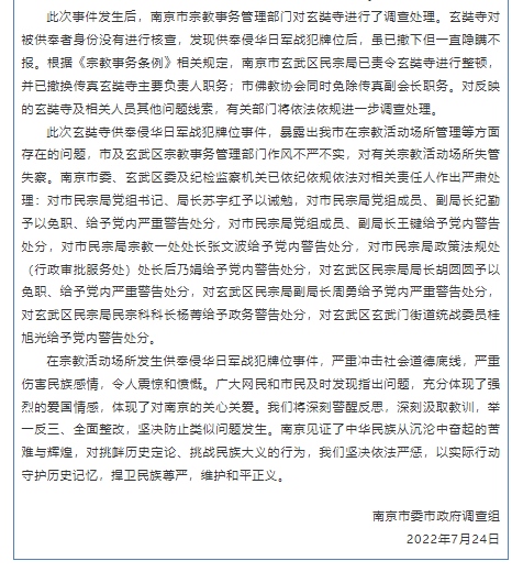 玄奘寺供奉侵華日軍戰(zhàn)犯牌位事件發(fā)生后,南京市委市政府迅速成立調(diào)查組,組織進行全面深入調(diào)查處理。現(xiàn)將有關(guān)情況通報如下。
