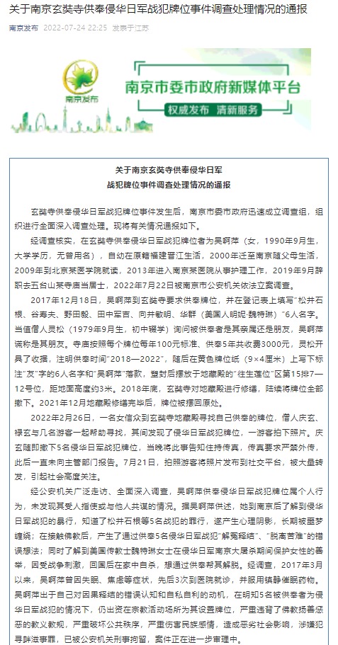 經(jīng)調(diào)查核實,在玄奘寺供奉侵華日軍戰(zhàn)犯牌位者為吳啊萍(女,1990年9月生,大學(xué)學(xué)歷,無曾用名),自幼在原籍福建晉江生活,2000年遷至南京隨父母生活,2009年到北京某醫(yī)學(xué)院就讀,2013年進入南京某醫(yī)院從事護理工作,2019年9月辭職去五臺山某寺廟當(dāng)居士,2022年7月22日被南京市公安機關(guān)依法立案調(diào)查。