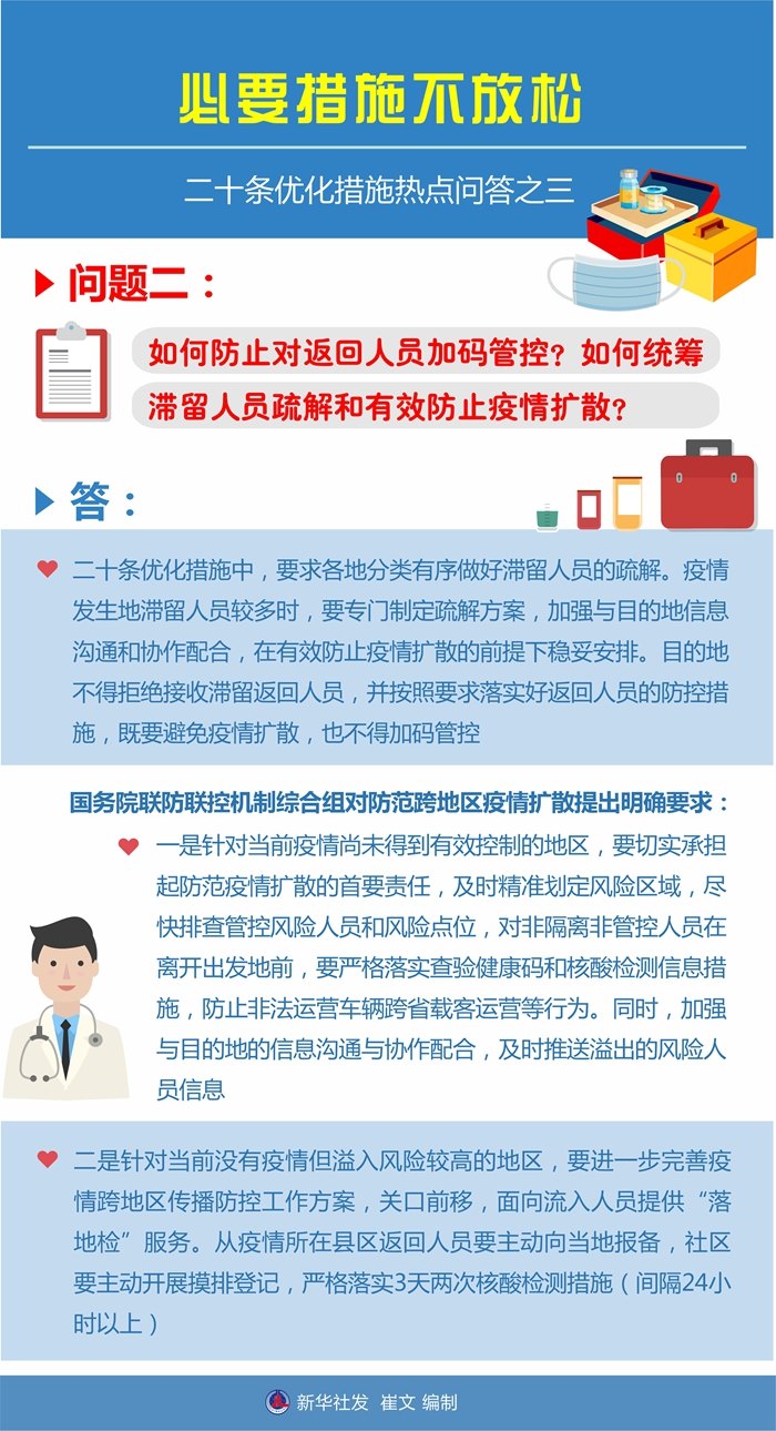 答:二十條優(yōu)化措施中,要求各地分類有序做好滯留人員的疏解。疫情發(fā)生地滯留人員較多時,要專門制定疏解方案,加強(qiáng)與目的地信息溝通和協(xié)作配合,在有效防止疫情擴(kuò)散的前提下穩(wěn)妥安排。目的地不得拒絕接收滯留返回人員,并按照要求落實好返回人員的防控措施,既要避免疫情擴(kuò)散,也不得加碼管控。