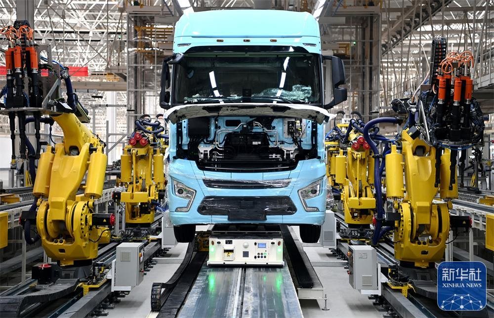 在陜汽重卡擴(kuò)能項(xiàng)目現(xiàn)場(chǎng),一輛重卡在汽車總裝生產(chǎn)線輪胎自動(dòng)化裝配擰緊無人工作站進(jìn)行裝配(9月27日攝)。新華社記者 劉瀟 攝