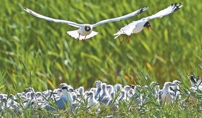 陜西省神木市紅堿淖國家級(jí)自然保護(hù)區(qū),遺鷗在島上飛翔。 新華社記者 陶 明攝