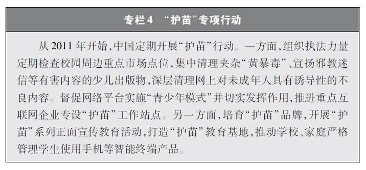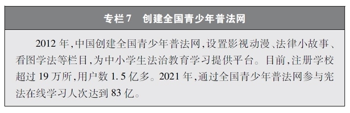加強(qiáng)青少年網(wǎng)絡(luò)法治宣傳教育。青少年是祖國(guó)的未來(lái)、民族的希望。青少年網(wǎng)民在中國(guó)網(wǎng)民中的占比逐步增長(zhǎng)。作為互聯(lián)網(wǎng)的“原住民”,青少年是網(wǎng)上學(xué)習(xí)、交流、生活最活躍的參與者、實(shí)踐者,其合法權(quán)益也更易受到網(wǎng)絡(luò)違法活動(dòng)的侵害。中國(guó)從保護(hù)青少年網(wǎng)絡(luò)權(quán)益,促進(jìn)青少年健康成長(zhǎng)、全面發(fā)展出發(fā),遵循青少年身心發(fā)展規(guī)律,貼近青少年學(xué)習(xí)生活實(shí)際,聚焦網(wǎng)絡(luò)沉迷、網(wǎng)絡(luò)欺凌、網(wǎng)絡(luò)淫穢色情信息等重點(diǎn)問題,通過普法微綜藝、兒童普法話劇、網(wǎng)絡(luò)普法故事廣播、網(wǎng)絡(luò)普法云課堂、學(xué)法用法知識(shí)競(jìng)賽、法治副校長(zhǎng)進(jìn)校園、編寫網(wǎng)絡(luò)普法讀本等生動(dòng)活潑、豐富多彩的形式開展法治宣傳教育,逐步形成了政府、社會(huì)、學(xué)校、家庭相結(jié)合的法治宣傳教育格局,為提升青少年網(wǎng)民法治意識(shí)和網(wǎng)絡(luò)安全素養(yǎng)提供了全面保障。