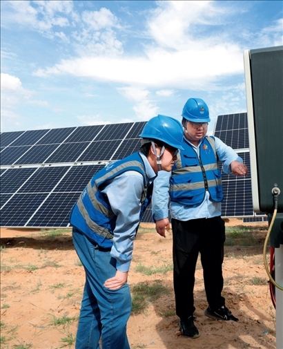 ▲ 國(guó)家電投五凌電力余丁光伏電站職工在檢修設(shè)備(2022年8月31日攝) 盧鷹攝
