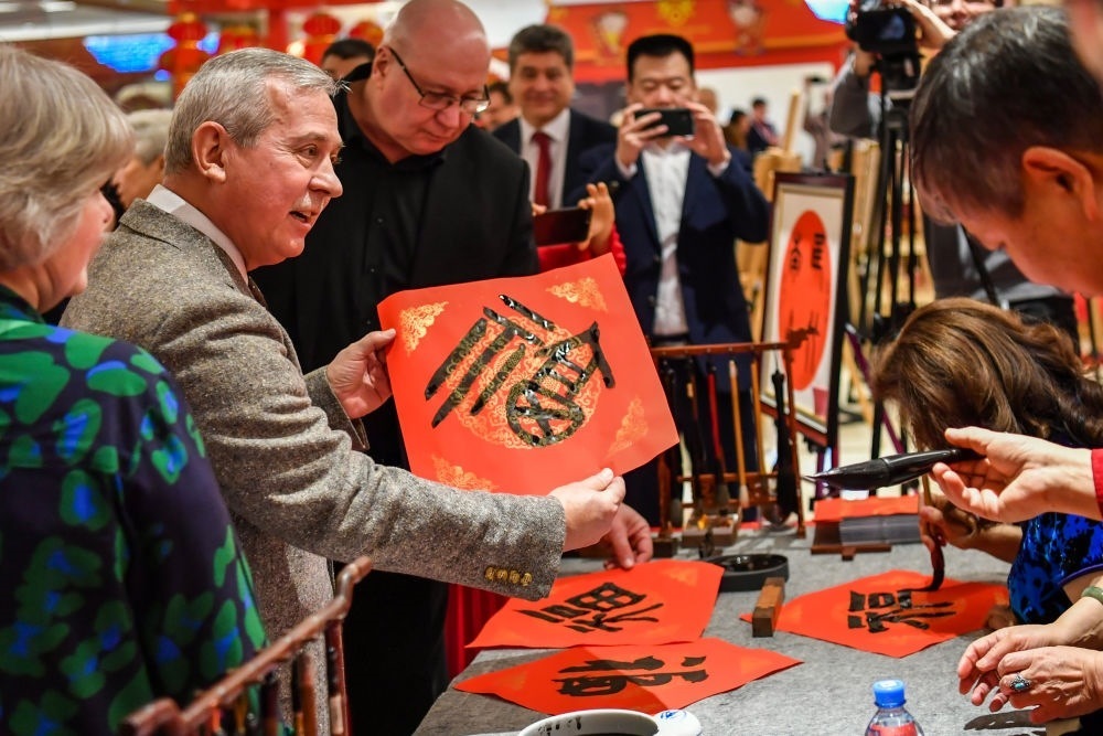 ↑2023年1月20日,來賓在俄羅斯莫斯科舉行的“歡樂春節(jié)—中國文化廟會”活動上接到福字。中俄兩國人文交流日益密切,中俄友好社會民意基礎(chǔ)愈加穩(wěn)固。