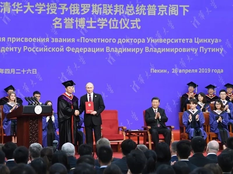 2019年4月,普京總統(tǒng)率團(tuán)來華,出席第二屆“一帶一路”國際合作高峰論壇。期間,在北京友誼賓館,中方還有一項特殊安排:清華大學(xué)向普京總統(tǒng)授予名譽(yù)博士學(xué)位。