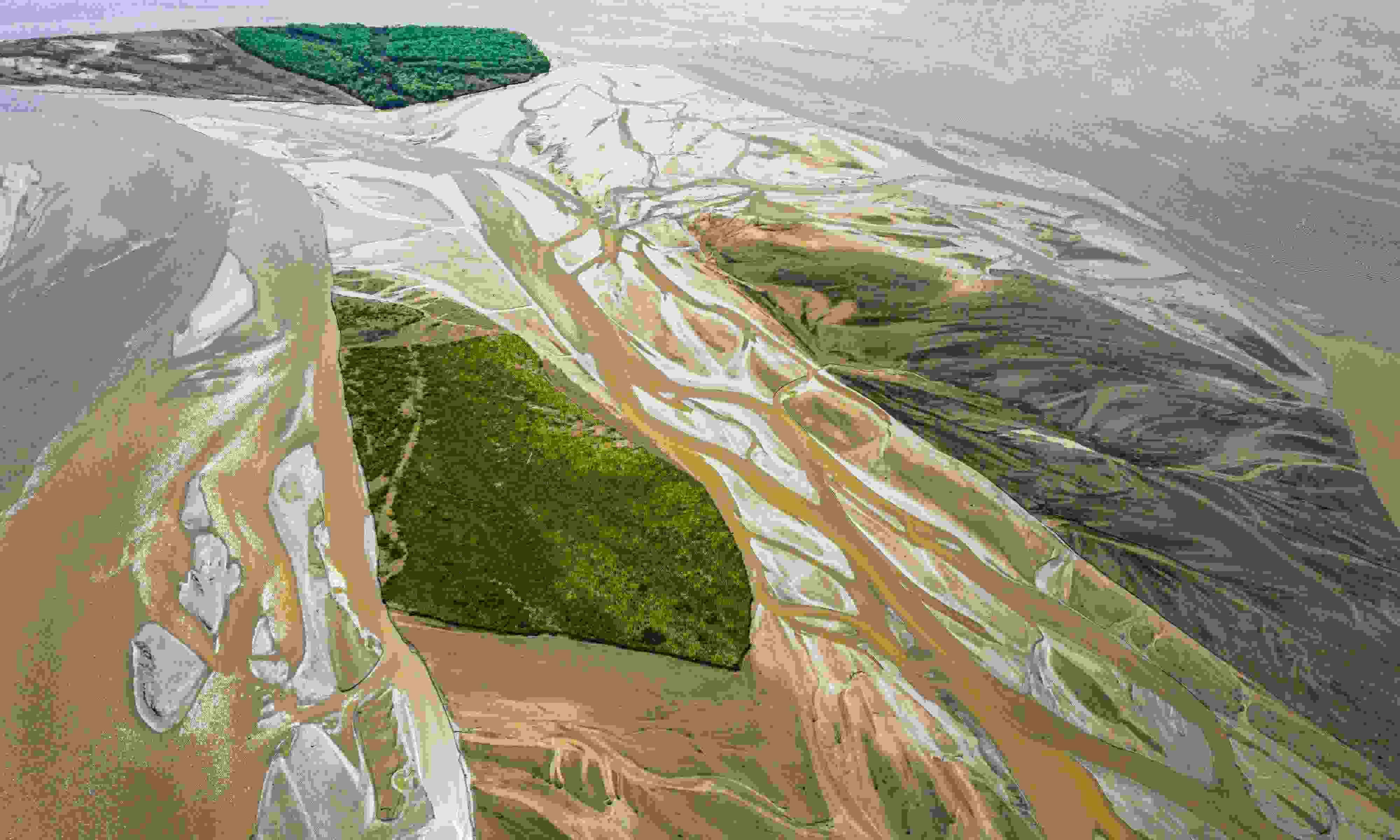 4月16日,山西運(yùn)城,由于黃河上游降雨和庫(kù)區(qū)泄水水量增加,黃河永濟(jì)段河床在水流沖刷下河汊縱橫,高空俯瞰宛若“大地血脈”。 視覺(jué)中國(guó)