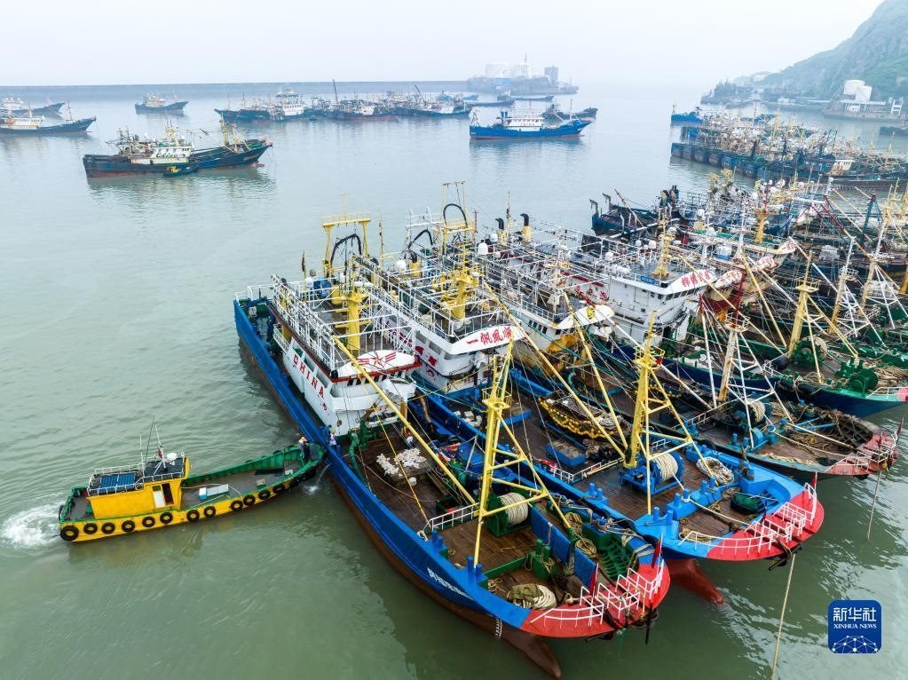 當日,在浙江省溫嶺市石塘鎮(zhèn),漁船陸續(xù)進港??浚蛹磳⒌絹淼男轁O期。新華社發(fā)(徐偉杰攝)