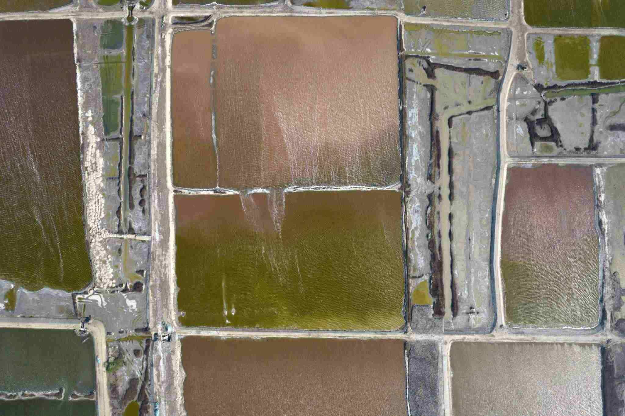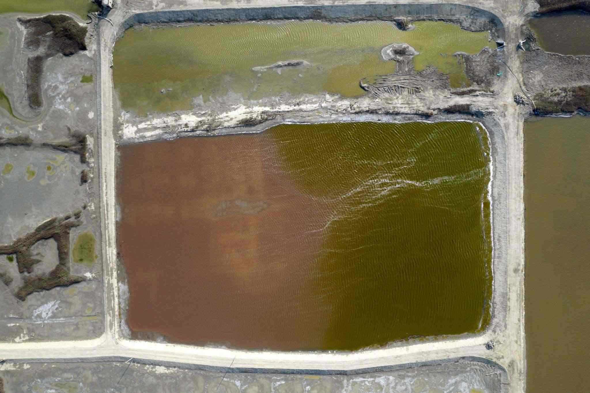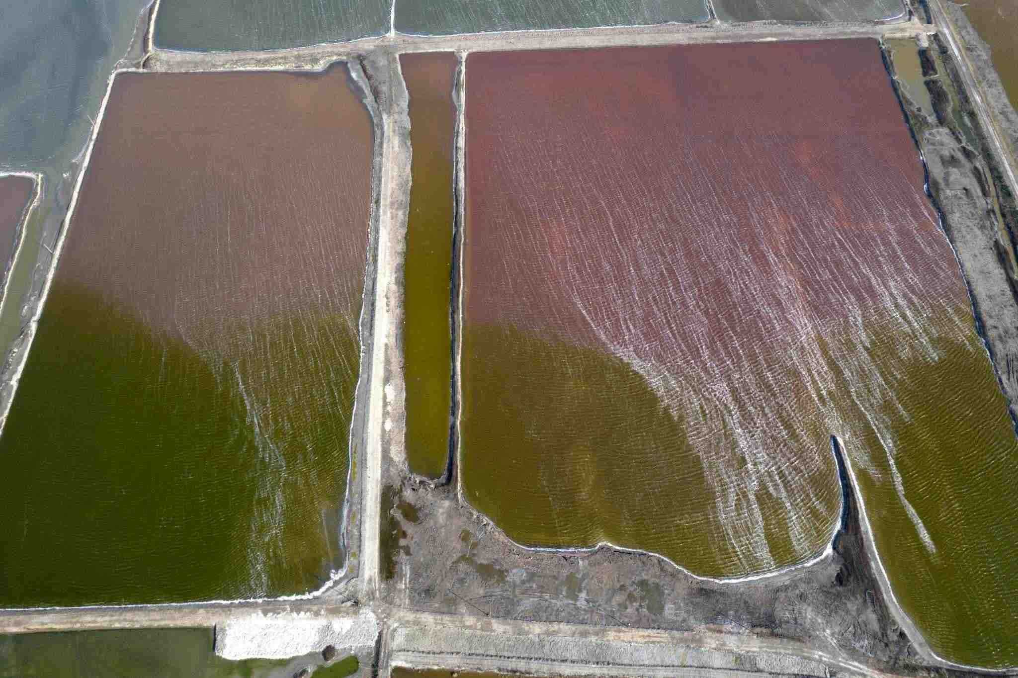 2023年4月26日,山西運城,七彩鹽湖水面出現“風吹波浪”景觀,大風吹起細密的水花,順著風向流動,十分壯觀。視覺中國