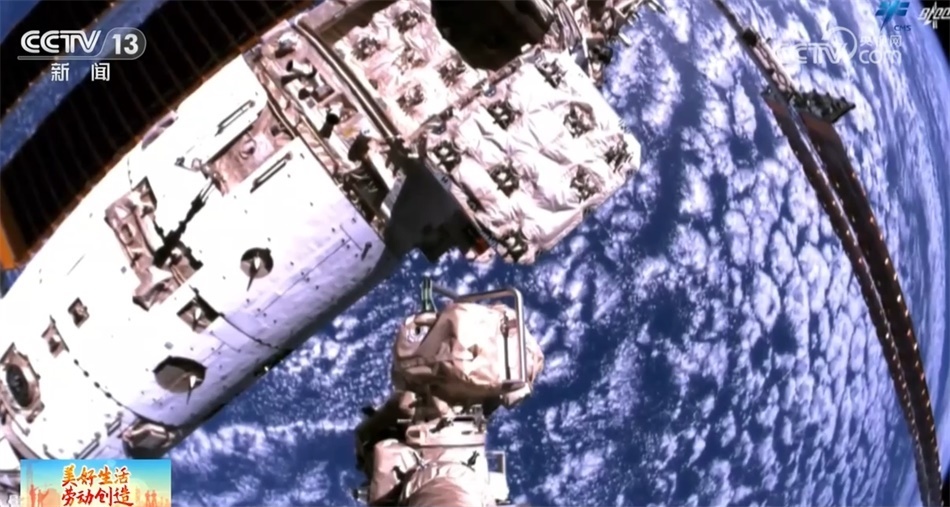 總臺(tái)央視記者 陶嘉樹:這個(gè)就是貨運(yùn)飛船的貨物艙,航天員所需的食物、水、實(shí)驗(yàn)設(shè)備等物資都是裝在這里“快遞”到空間站的。這個(gè)就是貨運(yùn)飛船與空間站的對接口,航天員就是通過這個(gè)對接口進(jìn)入貨運(yùn)飛船的。