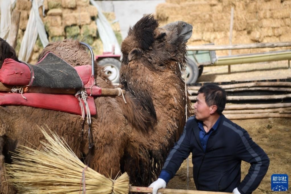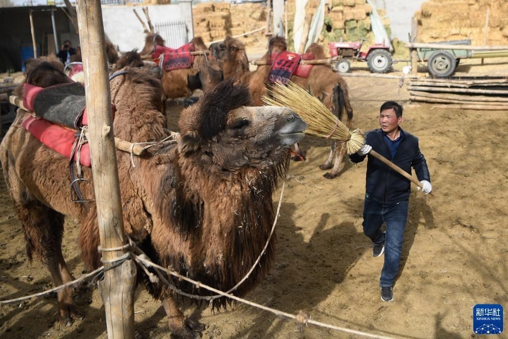 曹文華在駝圈里打掃衛(wèi)生,為駱駝“上班”做準(zhǔn)備(4月24日攝)。