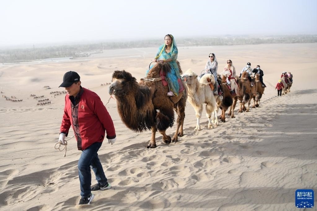 曹文華和他的駝隊(duì)載著游客行走在鳴沙山月牙泉景區(qū)的駝道上(4月24日攝)。