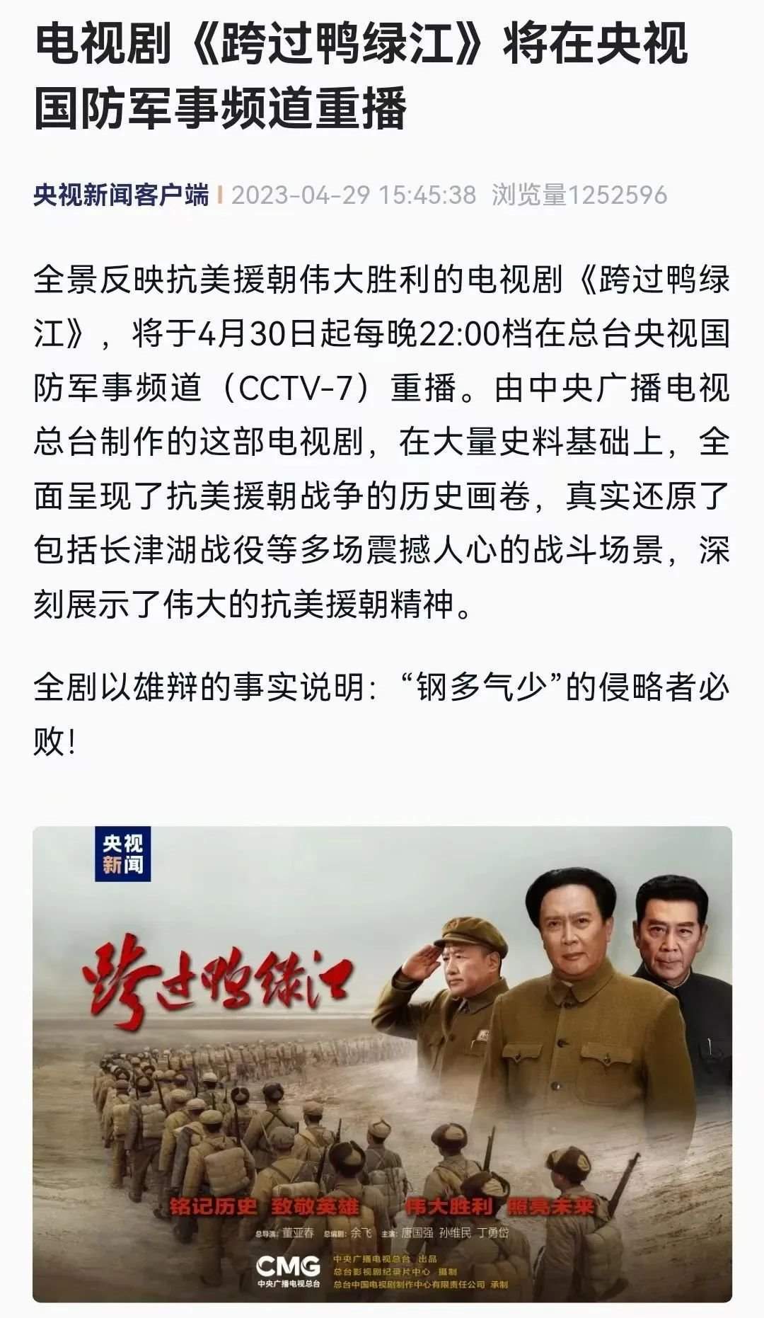 4月29日,中央廣播電視總臺發(fā)布預告:電視劇《跨過鴨綠江》自4月30日起每晚22點檔在央視國防軍事頻道重播。