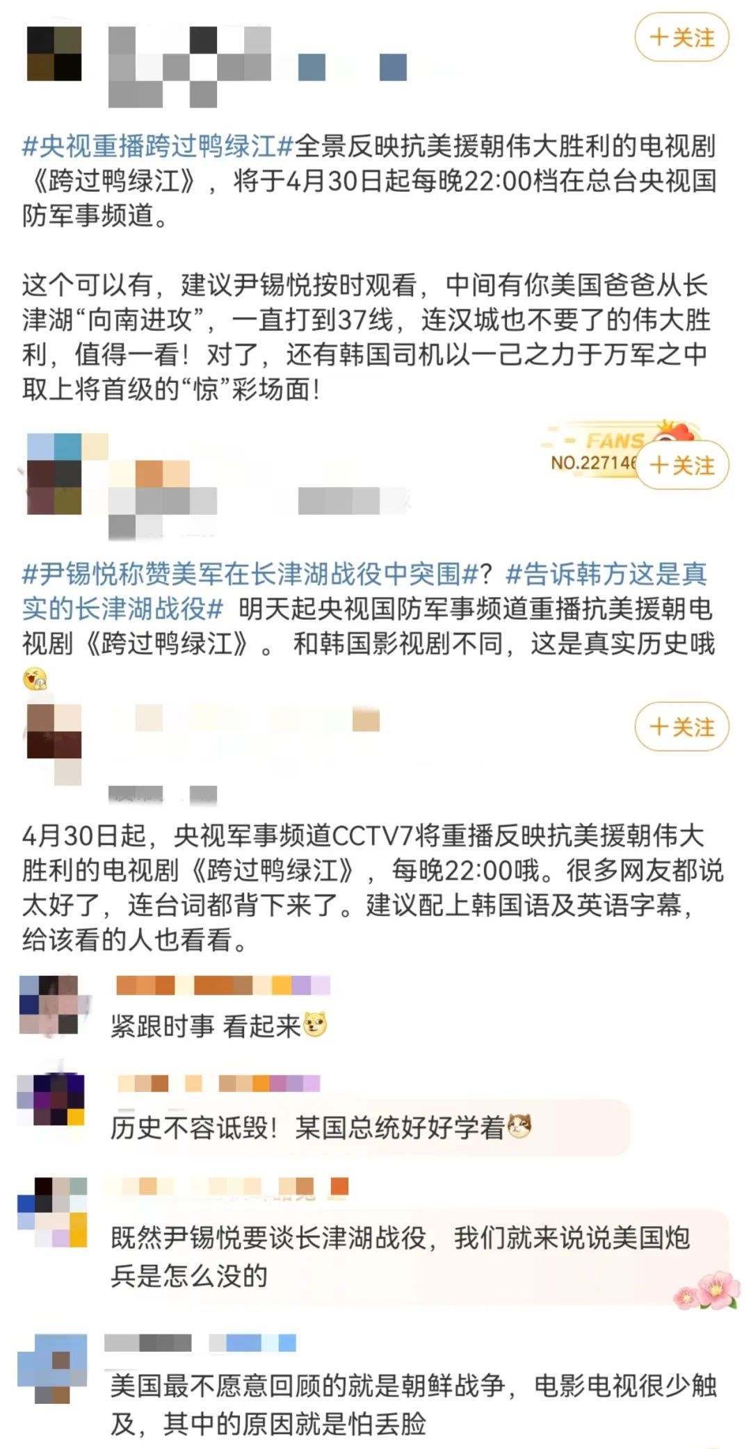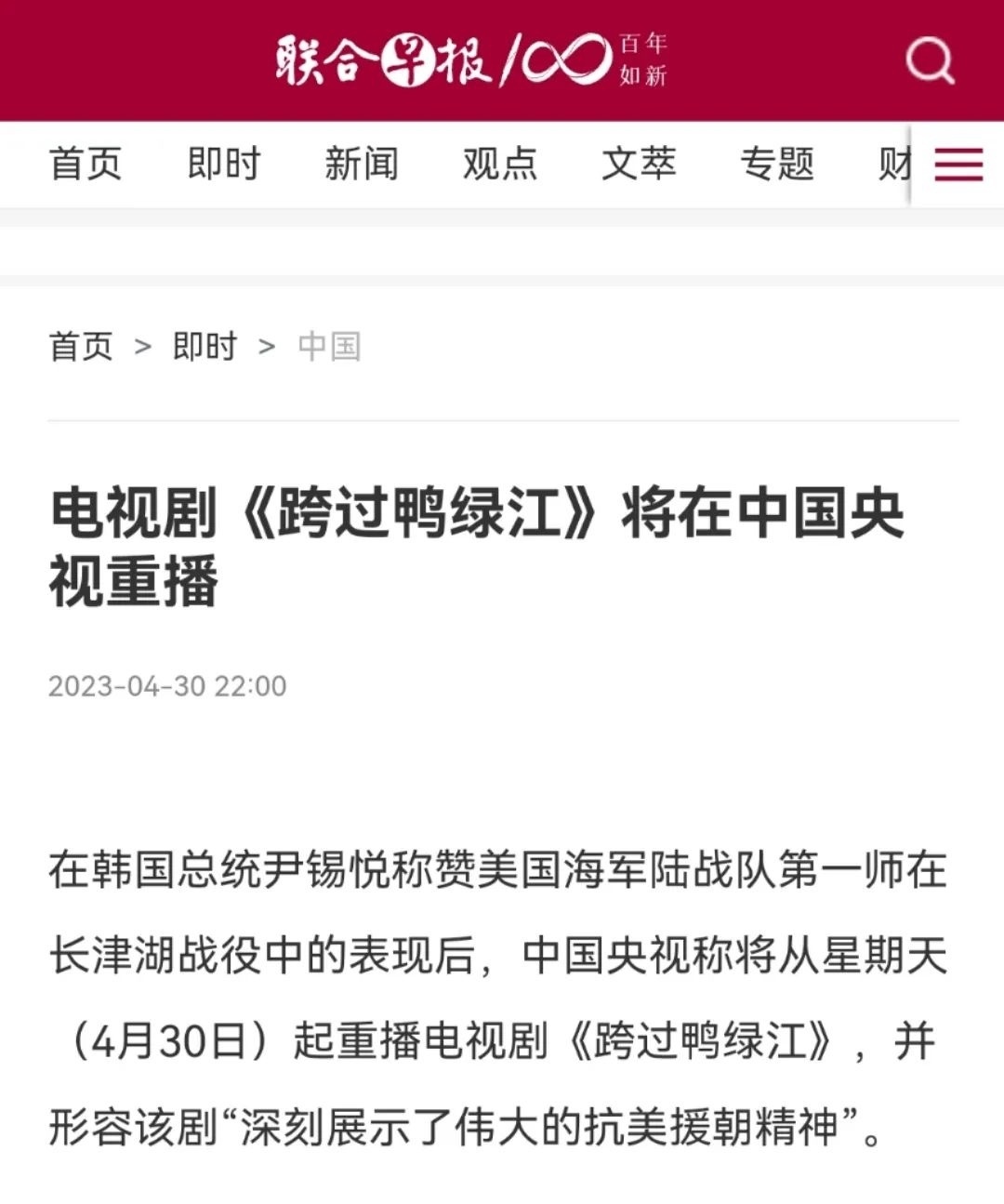 新加坡《聯(lián)合早報》更在4月30日晚10點準時發(fā)布文章《電視劇<跨過鴨綠江>將在中國央視重播》,開篇明確重點:在韓國總統(tǒng)稱贊美國海軍陸戰(zhàn)隊第一師在長津湖戰(zhàn)役中的表現(xiàn)后,中國央視稱將從星期天(4月30日)起重播電視劇《跨過鴨綠江》。