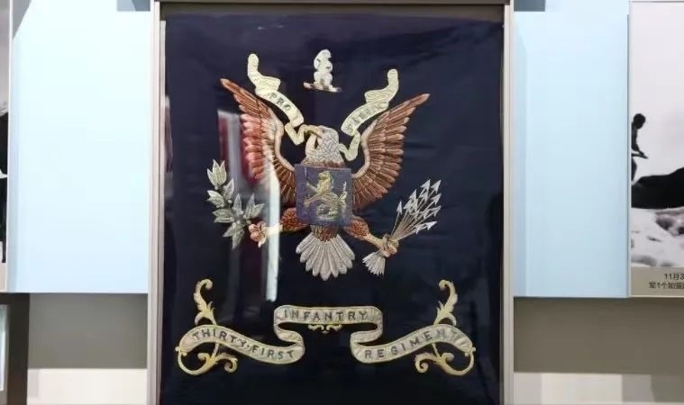 這是陳列在軍博的美軍“北極熊團團旗”。《跨過鴨綠江》真實還原了長津湖戰(zhàn)役中,志愿軍全殲美北極熊團并繳獲其團旗的全過程。