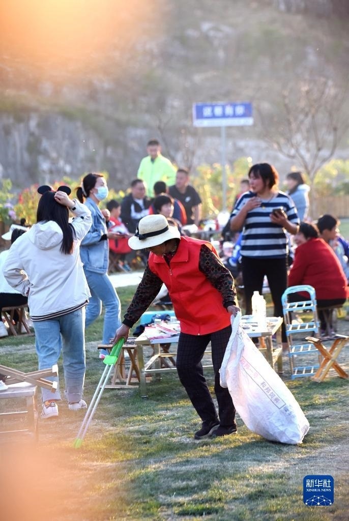 4月30日,在淄博市沂源縣悅莊鎮(zhèn)下龍巷村燒烤廣場,一名志愿者在撿拾垃圾。   新華社發(fā)(趙東山攝)