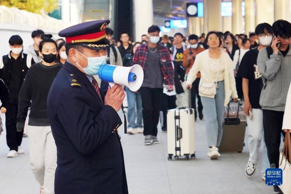 4月29日,淄博火車站工作人員在引導出站旅客。   新華社發(fā)(劉炳友攝)