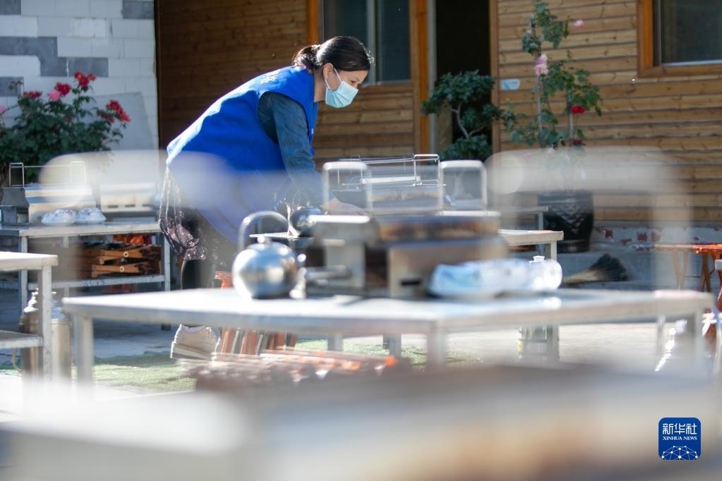 4月30日,一名社區(qū)工作者在淄博市高青縣田鎮(zhèn)街道幫助燒烤攤主擺放餐具。   新華社發(fā)(張維堂攝)