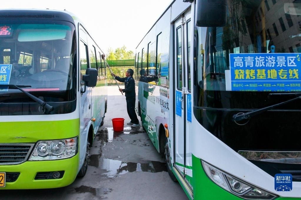 4月29日,在淄博市高青縣客運站,一名司機在保養(yǎng)車輛。當地推出1元“燒烤公交”專線方便游客出行。   新華社發(fā)(張維堂攝)