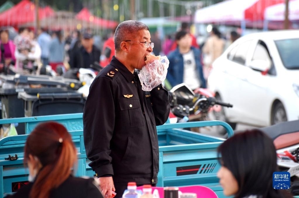 4月30日,在淄博市沂源縣悅莊鎮(zhèn)下龍巷村燒烤廣場,鎮(zhèn)市場監(jiān)督管理所的一名工作人員在值勤現場吃晚餐。   新華社發(fā)(趙東山攝)