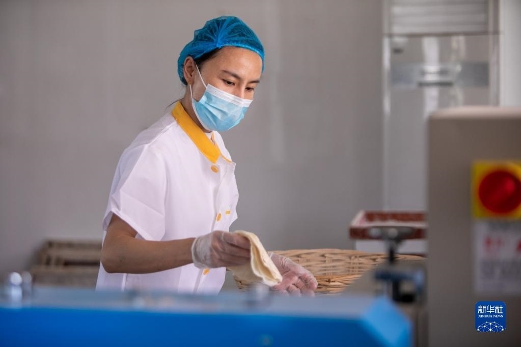 4月30日,在淄博市高青縣田鎮(zhèn)街道一家食品加工企業(yè),工作人員在趕制小餅訂單。   新華社發(fā)(張維堂攝)