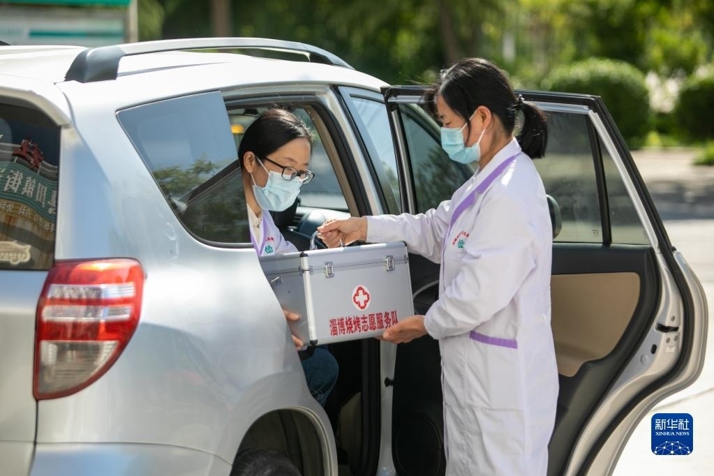 4月30日,在淄博市高青縣田鎮(zhèn)街道,志愿者備好常用藥品準備乘車前往一個燒烤服務點工作。   新華社發(fā)(張維堂攝)