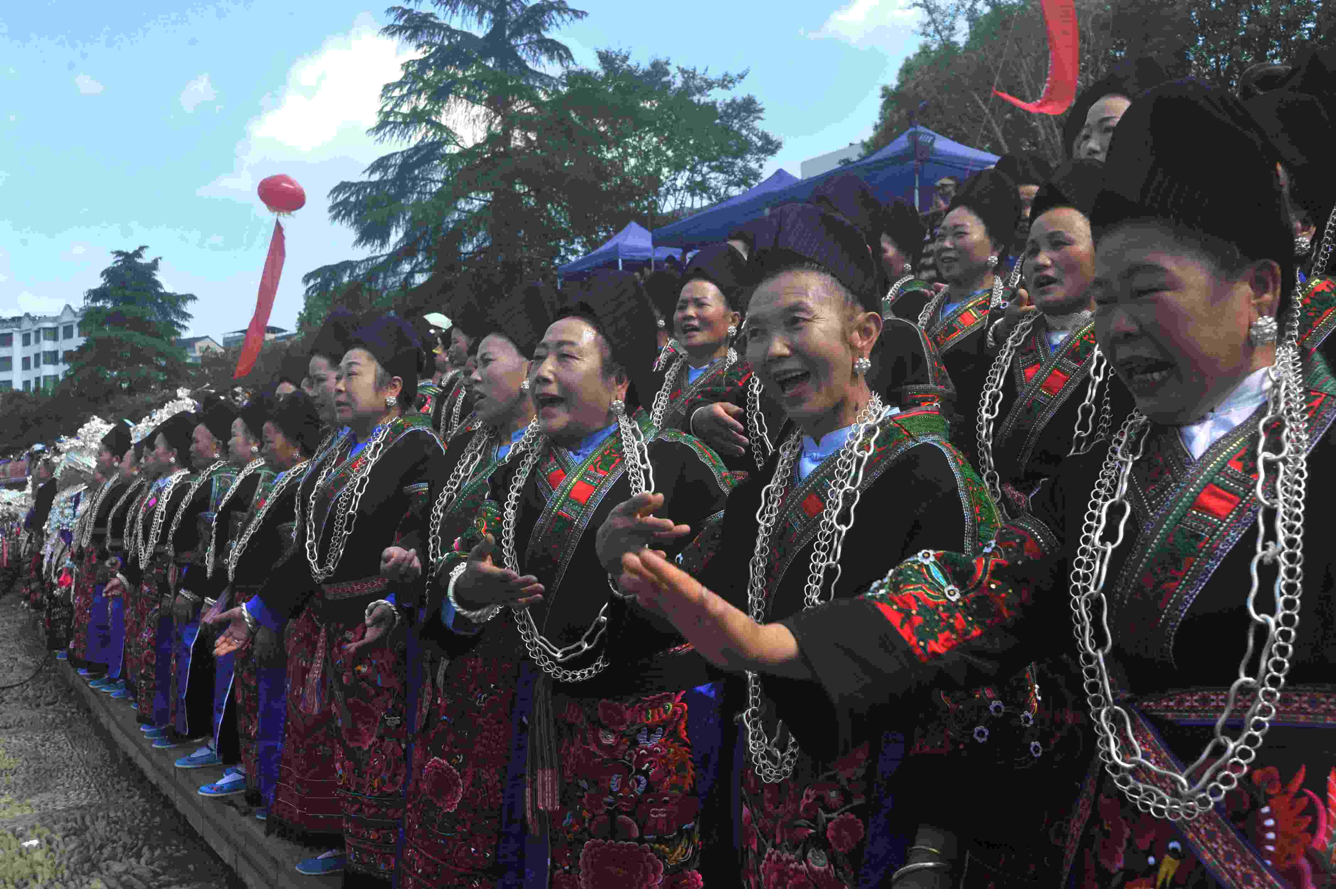 2023年5月3日,苗族同胞在貴州省臺江縣翁你河畔對唱苗歌。當日,貴州省臺江縣九個苗族支系的萬余名苗族男女歌手齊聚縣城翁你河畔,對唱苗族古歌、苗族多聲部情歌和飛歌,向世人展示古樸濃厚的苗族文化底蘊。 (寧堅 鄧永生)