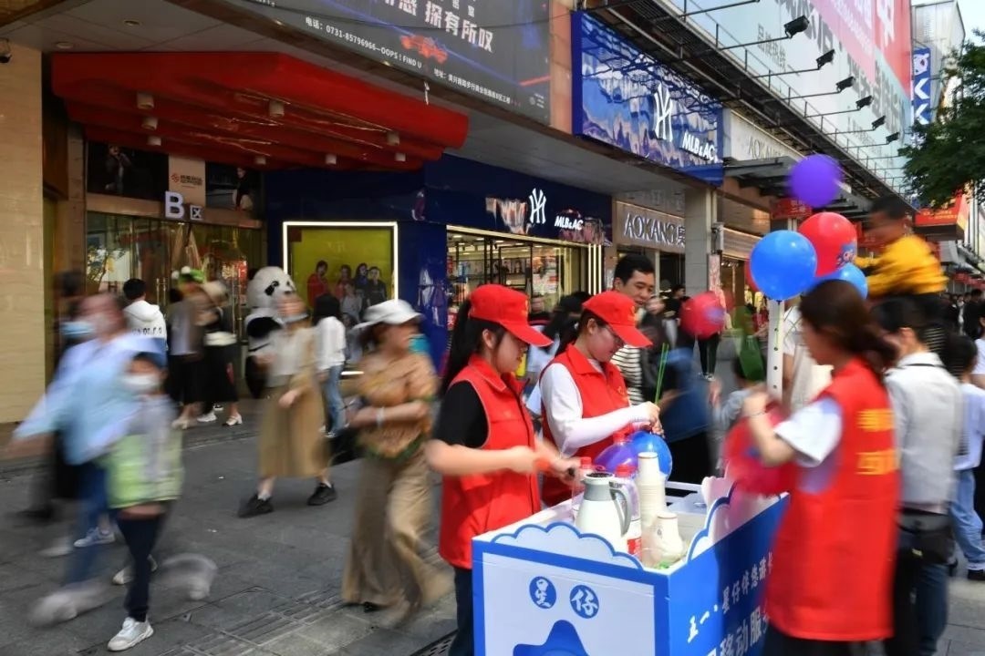5月1日,志愿者在湖南省長沙市天心區(qū)一處商圈做志愿服務(wù)。新華社記者 陳振海 攝