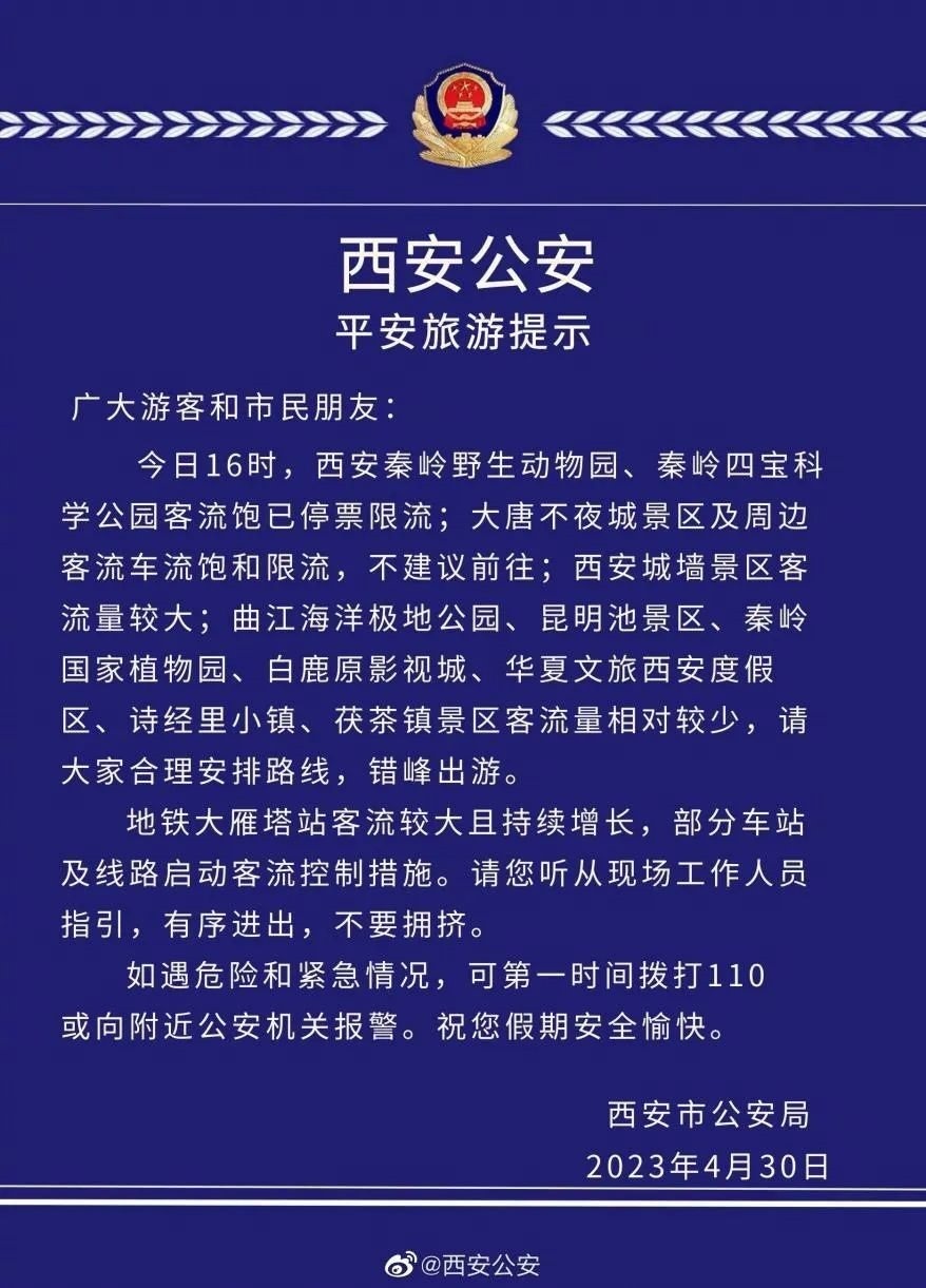 4月30日,西安多個景區(qū)停票限流。西安公安果斷發(fā)布旅游提示,不建議游客前往大唐不夜城,提示游客合理安排路線,錯峰出游。