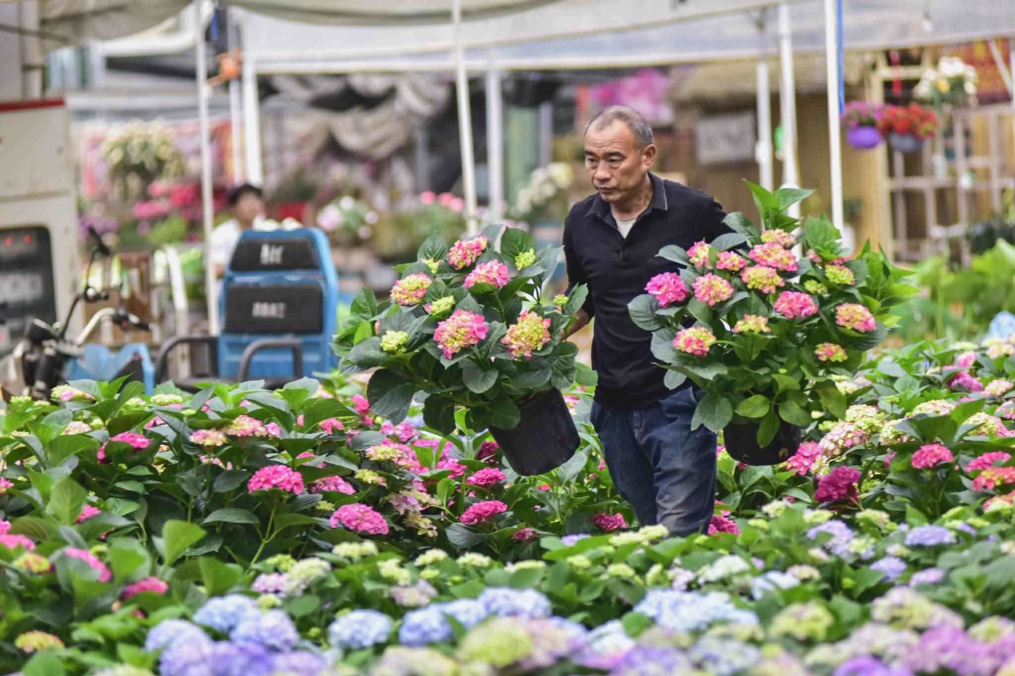 隨著母親節(jié)臨近,山東省青州市花卉苗木交易中心生意紅火起來,色彩艷麗且寓意吉祥的康乃馨、繡球、長壽花等受到消費者青睞。視覺中國