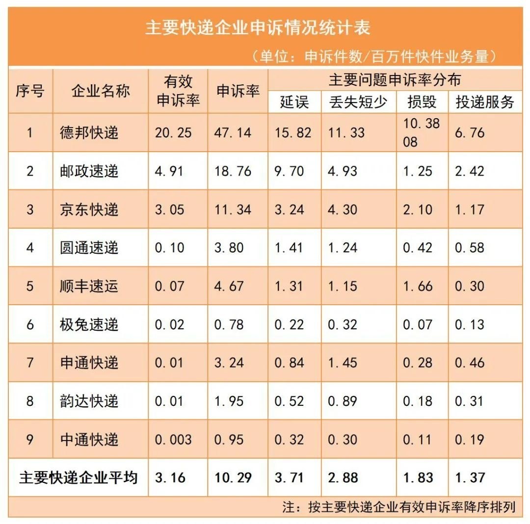 3.主要快遞企業(yè)申訴率情況。主要快遞企業(yè)申訴率(百萬(wàn)件快件業(yè)務(wù)量)平均為10.29,有效申訴率平均為3.16。用戶對(duì)快遞服務(wù)申訴主要問(wèn)題中,快件延誤申訴率平均為3.71,快件丟失短少申訴率平均為2.88,快件損毀申訴率平均為1.83,投遞服務(wù)申訴率平均為1.37。