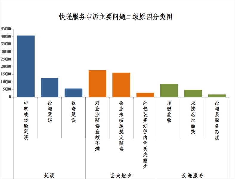 2.郵政普遍服務(wù)申訴主要問(wèn)題二級(jí)原因情況。郵件延誤申訴中主要占比較多的是中轉(zhuǎn)或運(yùn)輸延誤,投遞服務(wù)申訴中主要占比較多的是虛假簽收,郵件丟失短少申訴中主要占比較多的是企業(yè)未按照規(guī)定賠償。