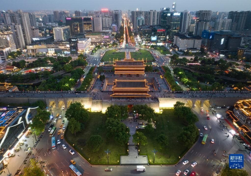 夜色下的西安城墻永寧門及周邊商圈(4月25日攝,無人機照片)。
