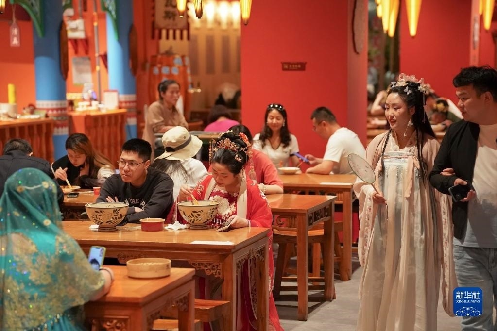 5月11日,游客在西安“長安十二時辰”主題街區(qū)內(nèi)用餐。