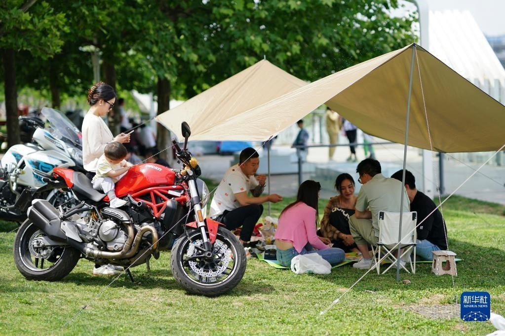 市民在西安灞河岸邊的公園內(nèi)露營休閑(2022年5月15日攝)。