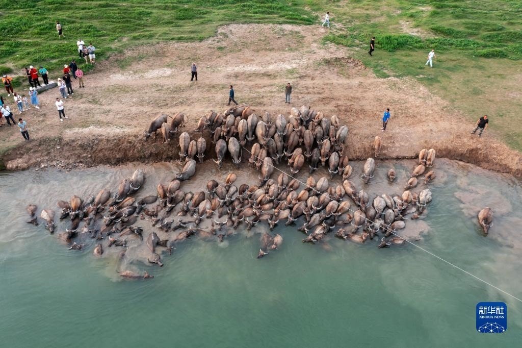 5月13日,在南充市蓬安縣相如鎮(zhèn)油房溝村嘉陵江段,成群結(jié)隊(duì)的水牛渡江(無人機(jī)照片)。