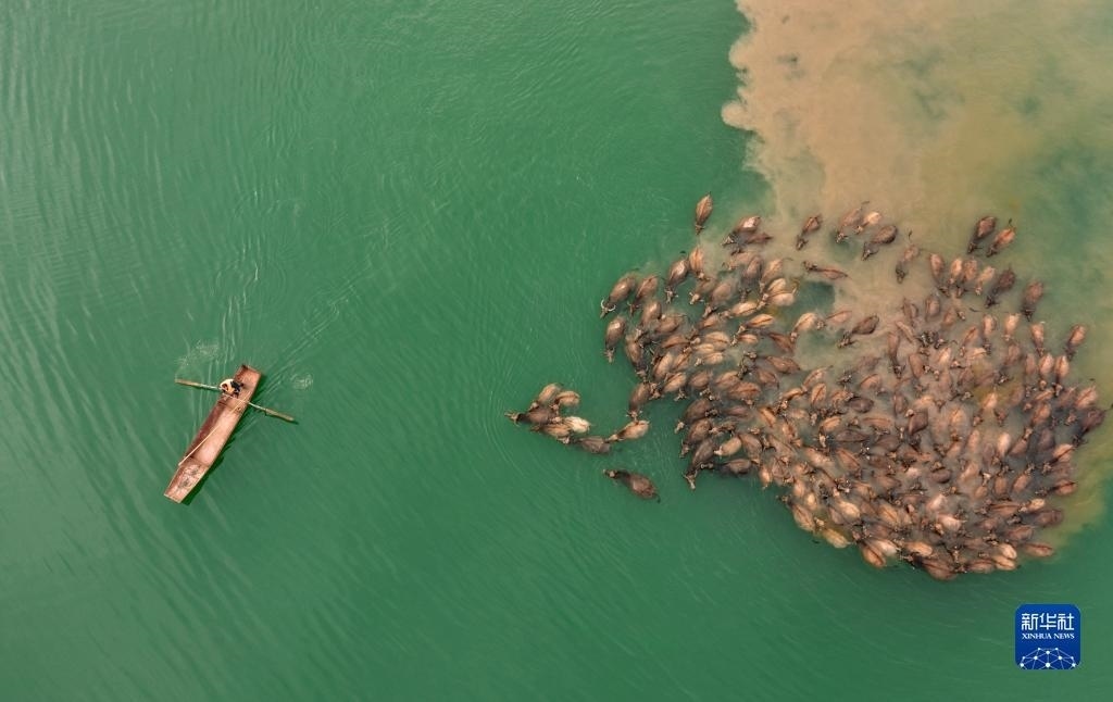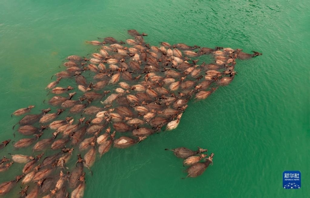 5月13日,在南充市蓬安縣相如鎮(zhèn)油房溝村嘉陵江段,成群結(jié)隊(duì)的水牛渡江(無人機(jī)照片)。   新華社發(fā)(周修建攝)