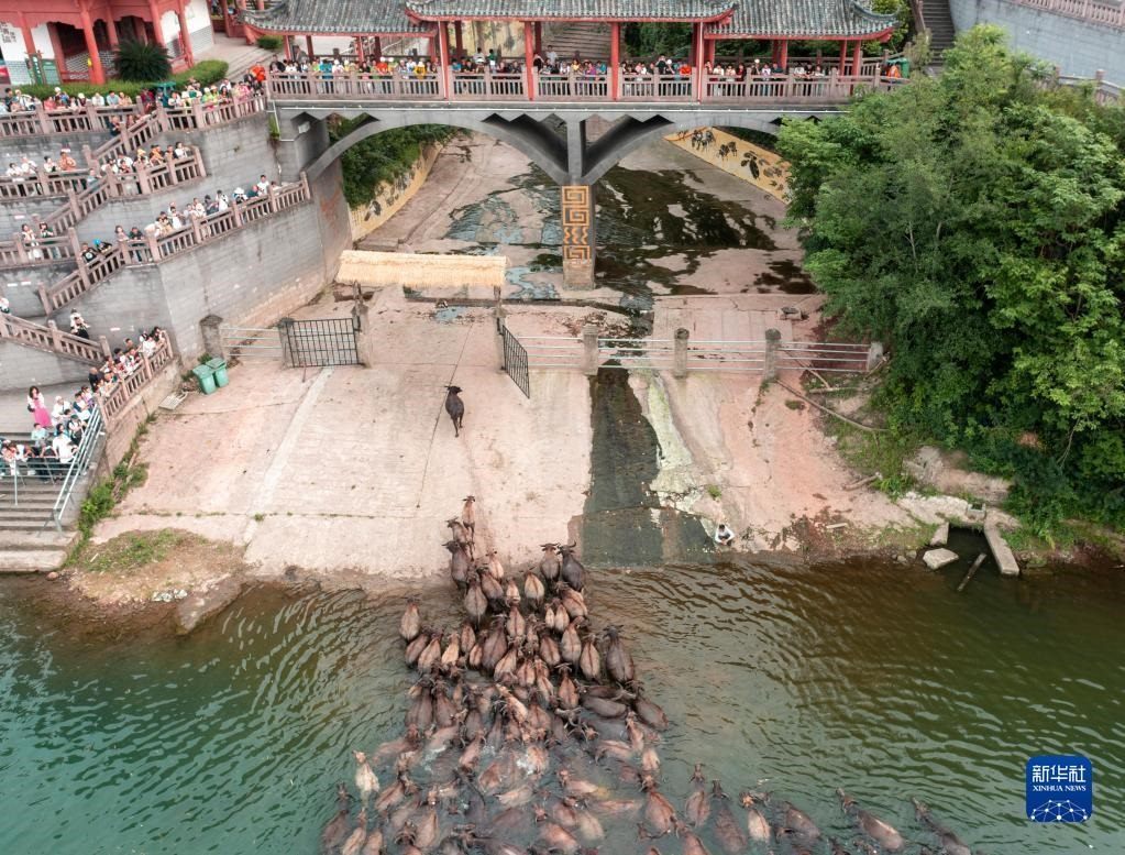 5月13日,在南充市蓬安縣相如鎮(zhèn)油房溝村嘉陵江段,游客觀看牛群渡江上岸(無人機(jī)照片)。   新華社發(fā)(周修建攝)