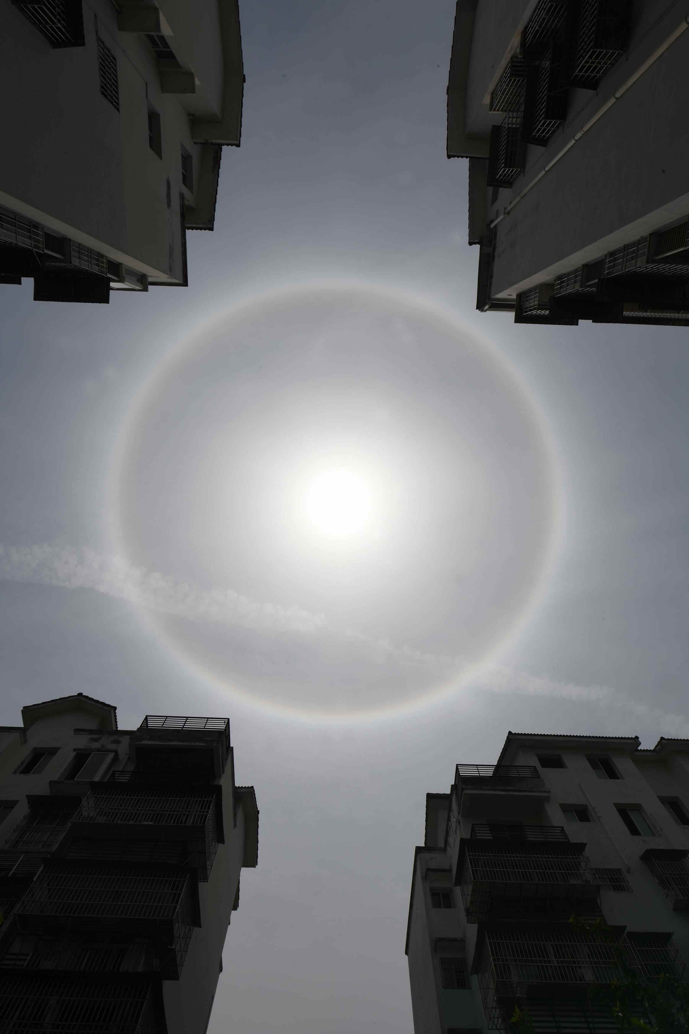 2023年5月15日中午,湖北宜昌,天空出現(xiàn)日暈景觀。當(dāng)日,多地天空出現(xiàn)日暈。日暈是一種大氣光學(xué)現(xiàn)象,是太陽(yáng)光通過云層中的冰晶折射或反射而形成的。 視覺中國(guó)