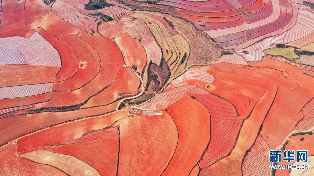 云南省尋甸回族彝族自治縣,連綿不斷的旱梯田遍布山間,遠(yuǎn)接天邊,每年4-5月,經(jīng)過村民翻新、平整后的紅褐色土地,從空中俯瞰五彩斑斕、蔚為壯觀。當(dāng)?shù)卮迕裥燎诟旁诜饰值募t土地上,用勤勞的雙手,繪就一幅幅勞動藝術(shù)畫作。新華網(wǎng)發(fā)(孫文來 攝影報(bào)道)