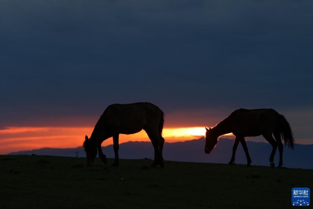 5月20日,夕陽下的那拉提草原上,馬在吃草。   新華社記者 郝昭 攝