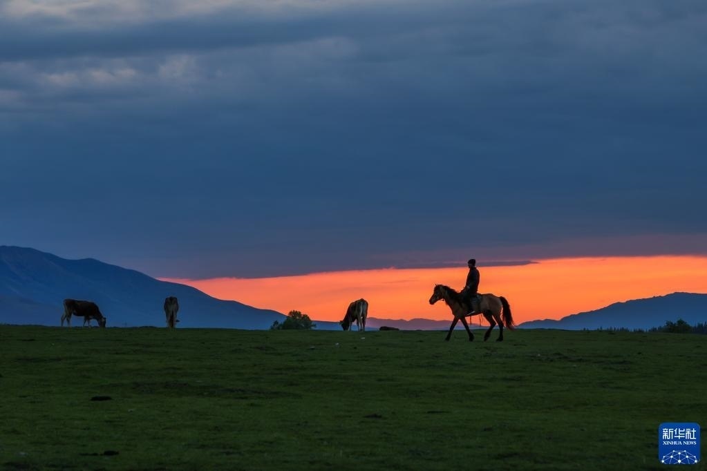 5月20日,夕陽下的那拉提草原上,牧民騎馬牧歸。   新華社記者 郝昭 攝