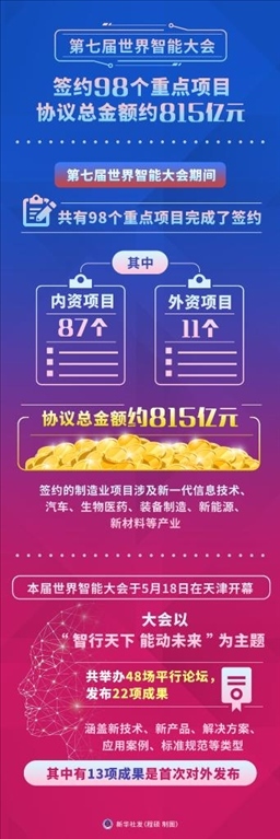 ·第七屆世界智能大會簽約98個重點項目,協(xié)議總金額約815億元。