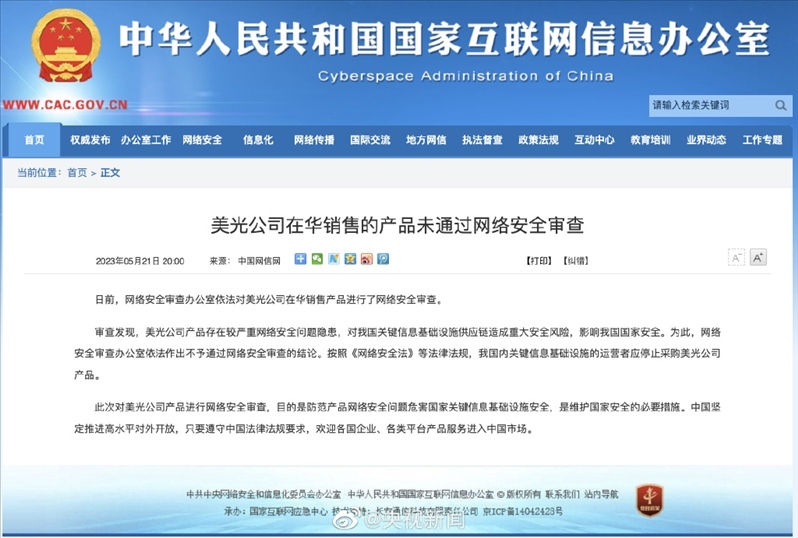 ·影響我國國家安全,美光公司在華銷售的產(chǎn)品未通過網(wǎng)絡(luò)安全審查。按照《網(wǎng)絡(luò)安全法》等法律法規(guī),我國內(nèi)關(guān)鍵信息基礎(chǔ)設(shè)施的運營者應(yīng)停止采購美光公司產(chǎn)品。