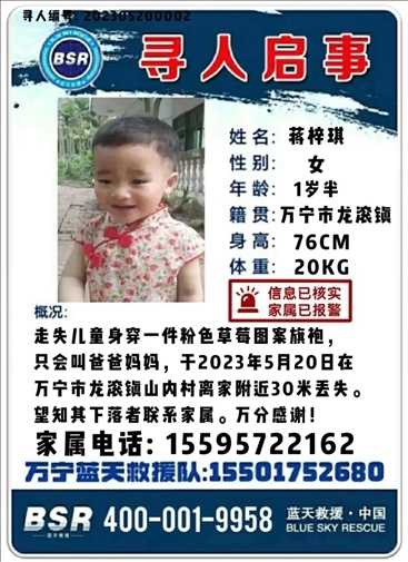 ·海南萬寧一歲半女嬰丟失一夜未歸,丟失地點離家僅30米。