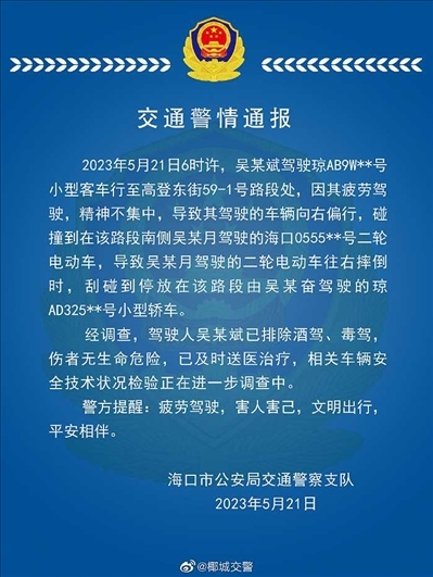 ·海口交警通報“一車輛沖上綠化帶撞倒環(huán)衛(wèi)工人”:司機疲勞駕駛,傷者無生命危險。
