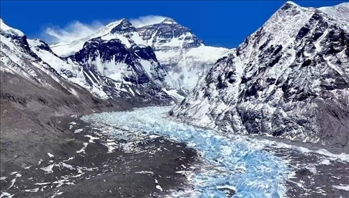 珠峰是“冰川家族聚集地”,廣泛分布著各類冰川。在珠峰北坡,純凈藍天下,絨布冰川于群峰間蜿蜒而下,晶瑩的冰塔錯落有致,壯麗奇幻。
