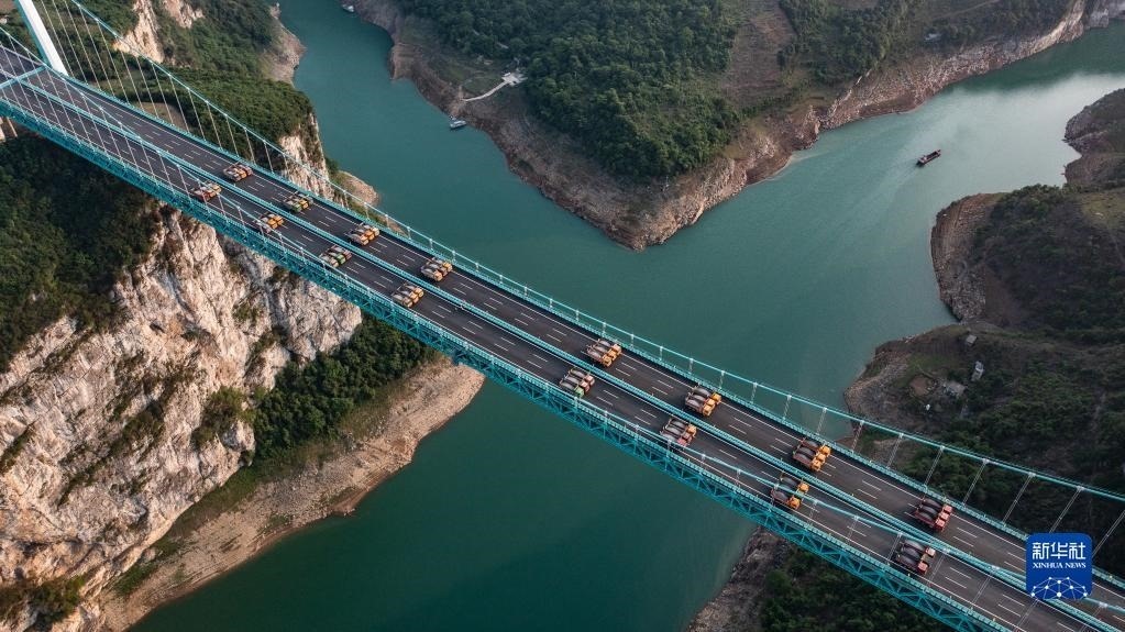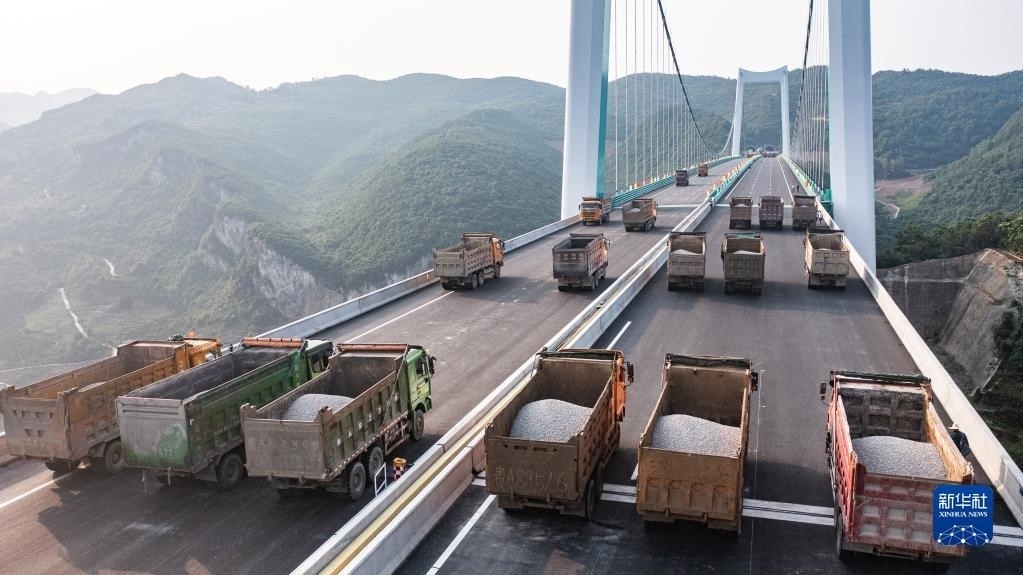 當(dāng)日,由貴州路橋集團(tuán)承建的金烽烏江大橋進(jìn)行靜態(tài)荷載試驗(yàn),48輛負(fù)載砂石的大型貨車有序行駛到固定的位置進(jìn)行對(duì)稱、偏心檢測(cè),檢驗(yàn)橋梁結(jié)構(gòu)整體的施工質(zhì)量與受力性能,為橋梁竣工驗(yàn)收提供科學(xué)依據(jù)。