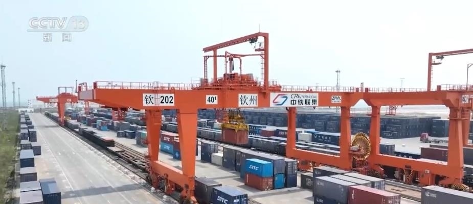 在西部陸海新通道關(guān)鍵節(jié)點的欽州港東站,鐵海聯(lián)運貨物上下列車、進(jìn)出港口24小時不停歇,每天最多到發(fā)的鐵海聯(lián)運班列有21列。截至目前,西部陸海新通道鐵海聯(lián)運班列已輻射我國17省份、60市、115個車站,通達(dá)全球119個國家和地區(qū)的393個港口。