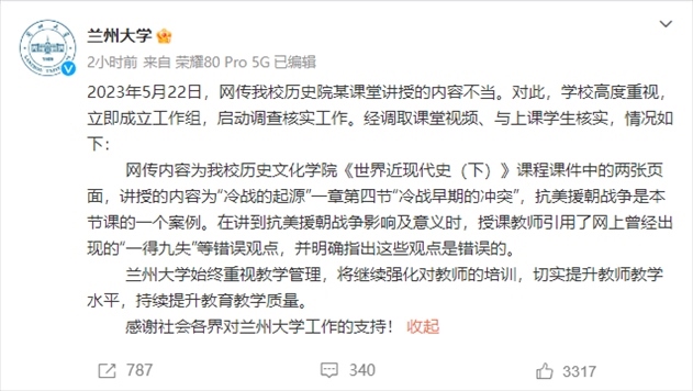·蘭州大學回應教師課堂上“歪曲歷史”:教師引用網(wǎng)上曾經(jīng)出現(xiàn)的錯誤觀點,并指出這些觀點是錯誤的。