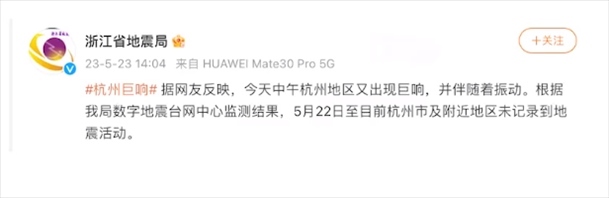 ·杭州地區(qū)出現(xiàn)巨響?浙江省地震局:未記錄到地震活動。